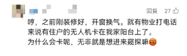 刚入住该小区的陈先生也表示,晚上11点,自己在家中和朋友聊天时,突然发现有一台无人机在离自己房间10米的地方上下垂直飞行,还曾停留在他家的窗前,“就算是航拍,为什么非要这个点?”